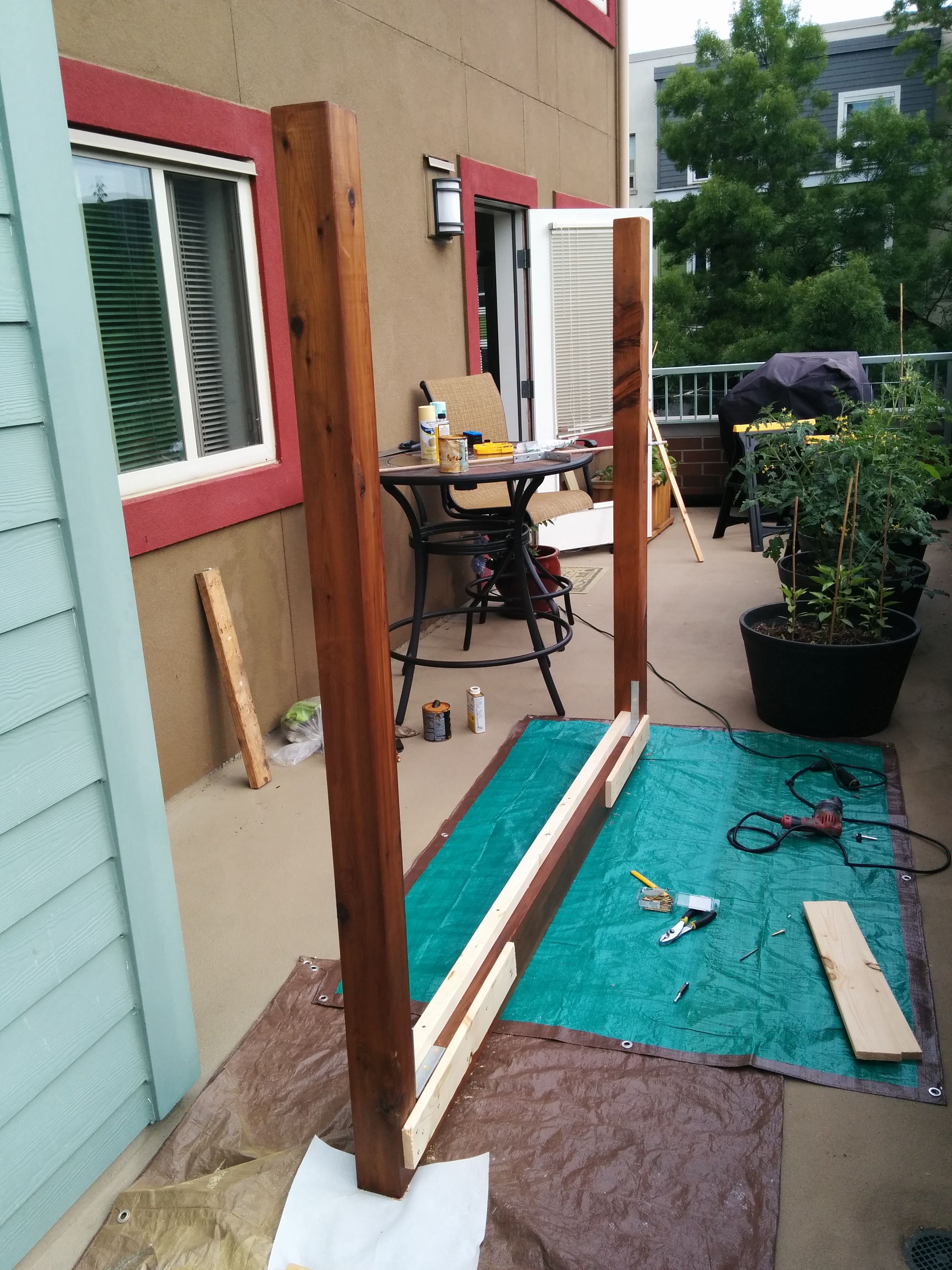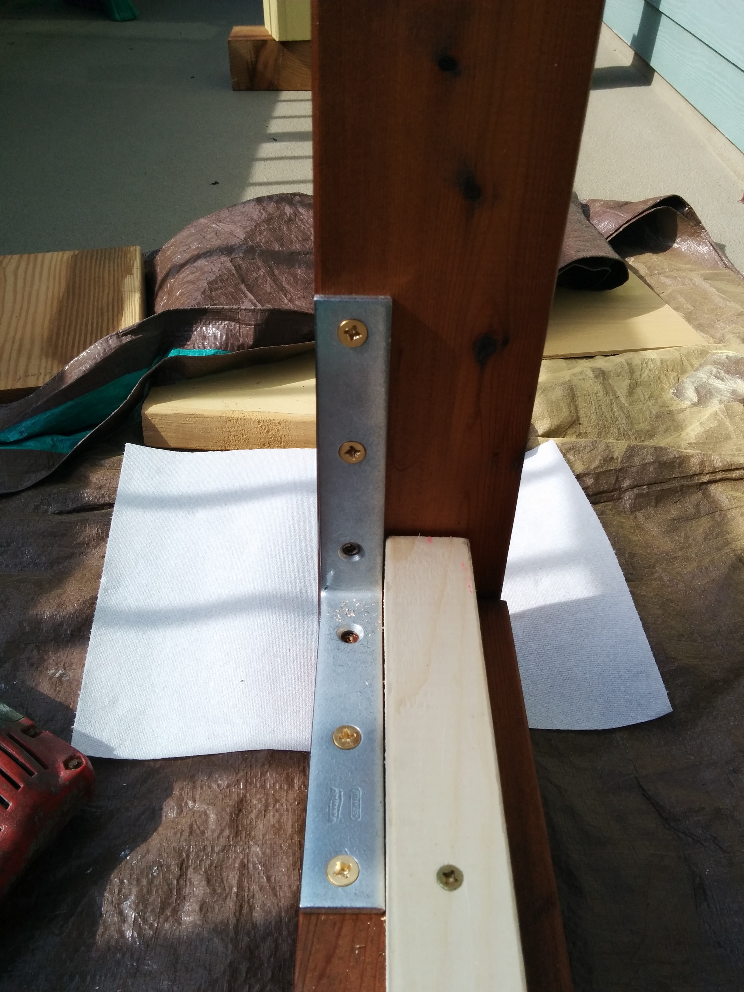 The order of attachment was such that I ended up with an L then a U and finally my nice rectangular frame. At each joint, I attached the corner braces and then the 1x4 on the bottom, as shown in this image: