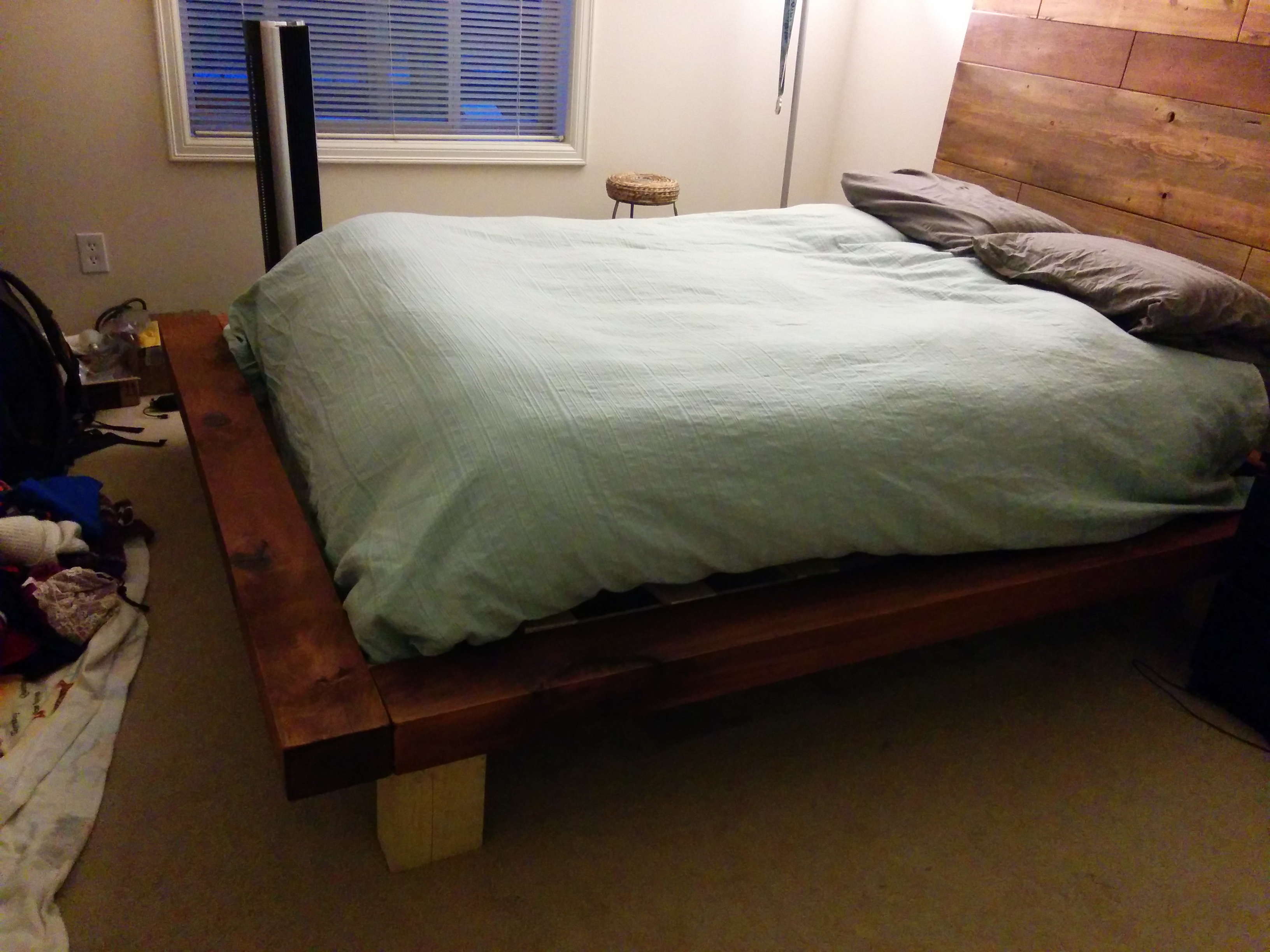 The largest project so far is a bed. I took a lot of time cobbling together various tutorials and images from across the web and Seattle's many furniture stores to finally settle on a platform bed that looks a lot like Crate and Barrel's Atwood bed. It turned out pretty simple and feels solid several months later, so here are the plans!